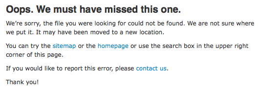 Design a useful “page not found” page. Make it as clever or funny as you like, but make sure you give the user alternative ways to find the page they were looking for so they don’t feel so helpless. This can be done by providing a site map, a search box or a list of top-level categories.