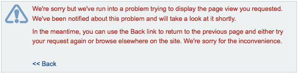 When a page blows up, unless you’re in a development environment you never want the user to see the stack trace. So, make sure that (a) there is a page in place to display when a 500 error occurs, (b) the app knows to display that page and (c) it gives useful feedback to the user.